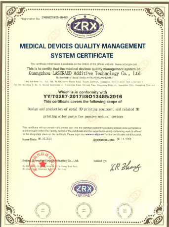 广州雷佳无源医疗器械配套用金属3D打印设备及零件设计与生产ISO 13485认证