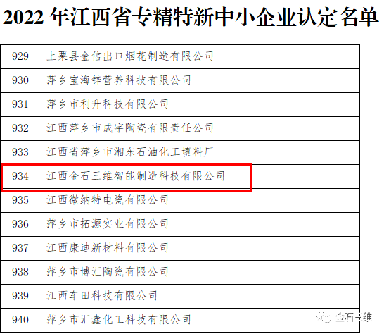 《办法》推行以来,金石三维旗下子公司江西金石和广州雷佳先后入选2022年江西省和广东省“专精特新中小企业”名单,充分彰显了金石三维深耕3D打印细分市场的科技硬实力。