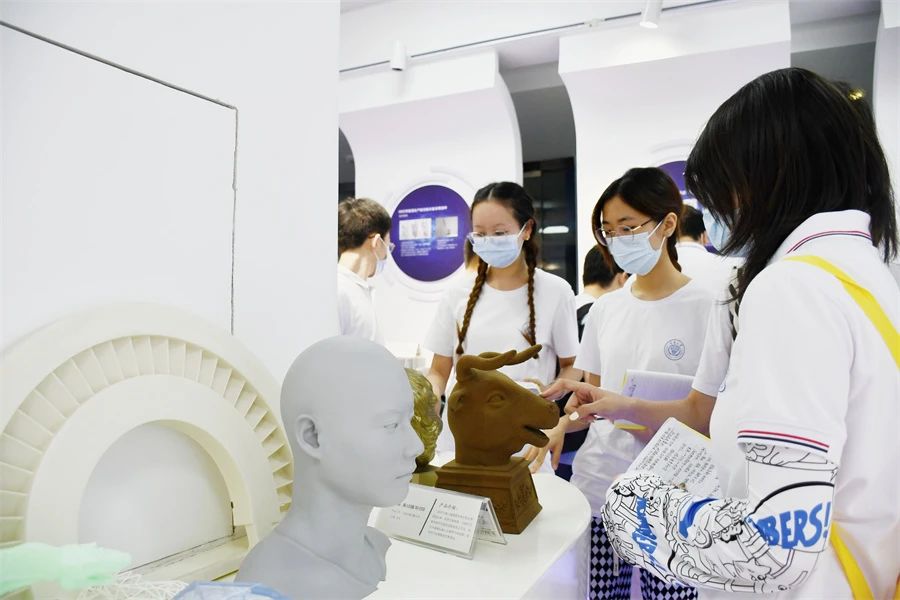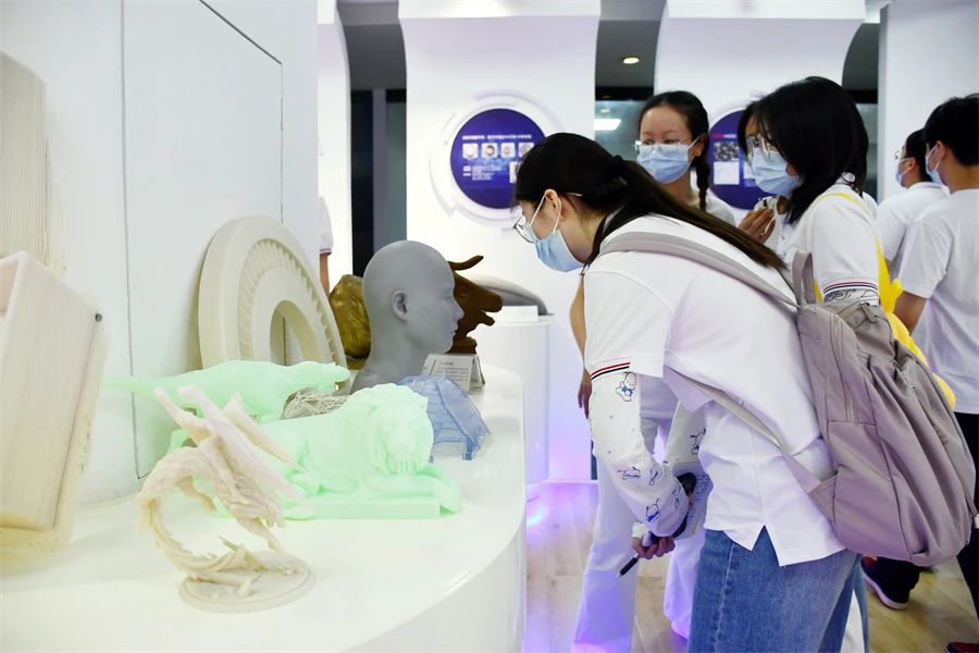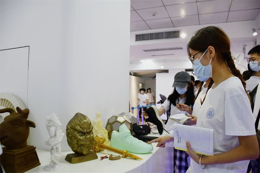 工厂参观分两组进行,重庆大学材料学院一行人分别参观了重庆金石的金属3D打印车间、砂型3D打印车间、尼龙3D打印车间、树脂3D打印车间和产品应用展厅。通过现场观摩和工作人员的讲解,让学生们亲身体验到各种3D打印设备的实际生产过程,大家对一个3D打印物件从无到有的造物过程充满了好奇。尤其是在产品应用展厅,大家看到了平时熟悉的树脂、金属、尼龙、砂型等材料打印的各种产品,再一次感受到了3D打印的神奇和魅力。